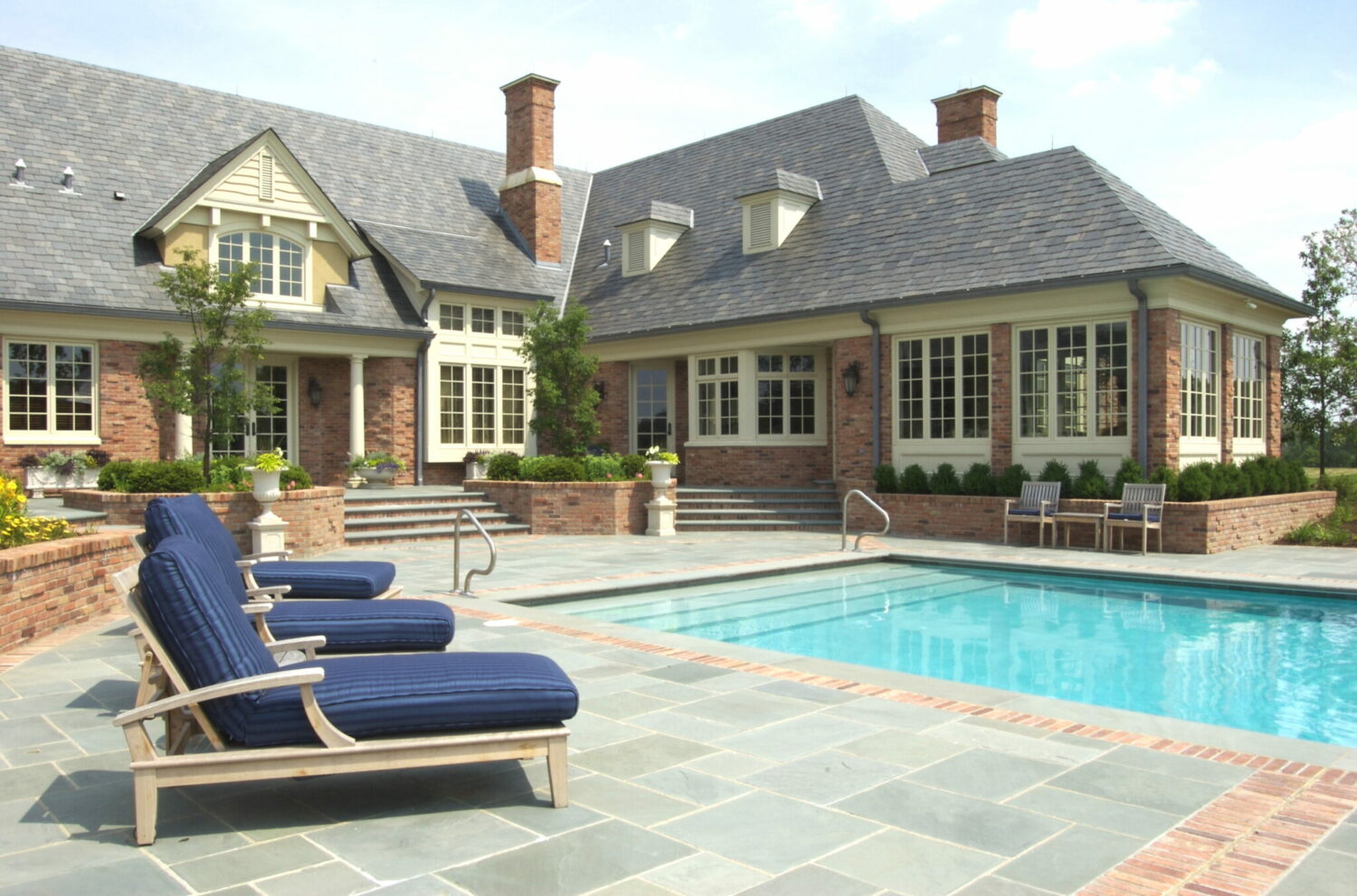 The original site for this project was a 100-acre farm field with no physical features and only slightly rolling topography posing a challenge for how to make a place for our client. The low-slung, single-floor living house branches and interacts with outbuildings in a way to shape positive outdoor space where one would feel comfortable outside as well as inside the house. Together with a landscape architect we situated the house in a way to create a place within larger outdoor spaces on the overall site. The gable roofed exterior asserts its personality through textured surfaces of skintled brickwork, wavy siding and slate roofing. The interior is detailed with care and attention to luxury living.